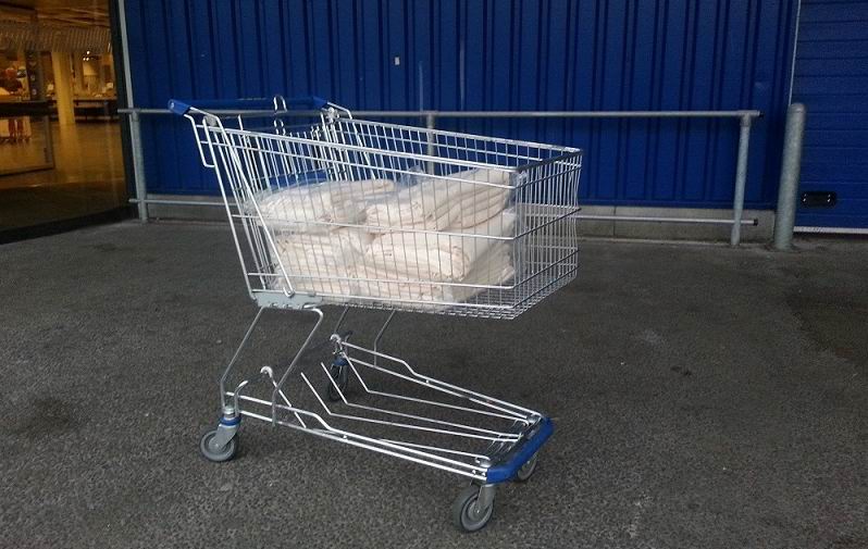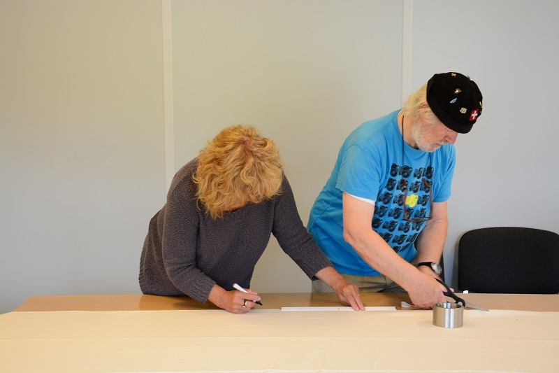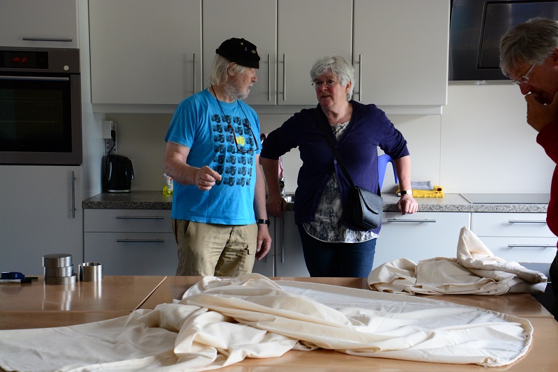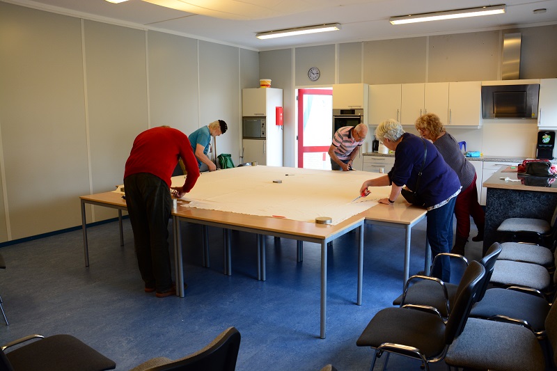 Eind mei was de materiaallijst klaar en konden de bestellingen geplaatst worden. Het parachute doek was er het eerst. Na het op maat knippen op een grote tafel in het Hoi-huis werden 17 doeken door Marian Krikken meegenomen voor behandeling en afwerking.