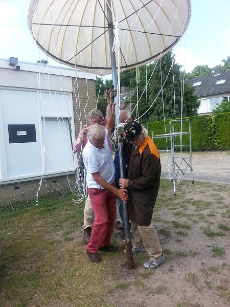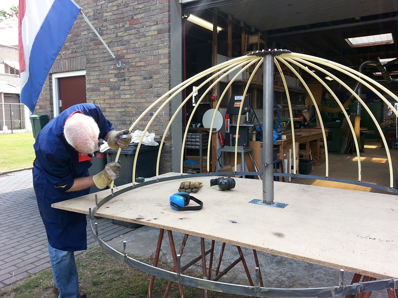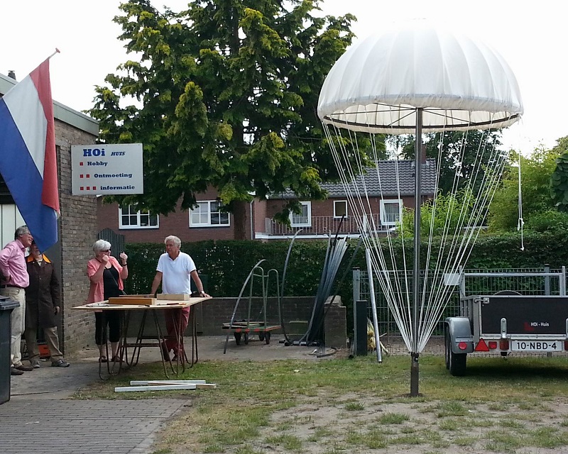 Eind juni arriveerden de buizen, strips en andere metalen grondstoffen. Met grote dank aan smid Jan Swinkels die het materiaal al op maat had gezaagd, kon de ploeg vrijwilligers op maandag 30 juni onder bezielde leiding van ontwerper Martien Leenders direct aan de slag met de constructie van de eerste parachute.