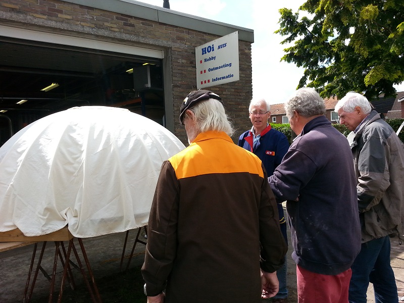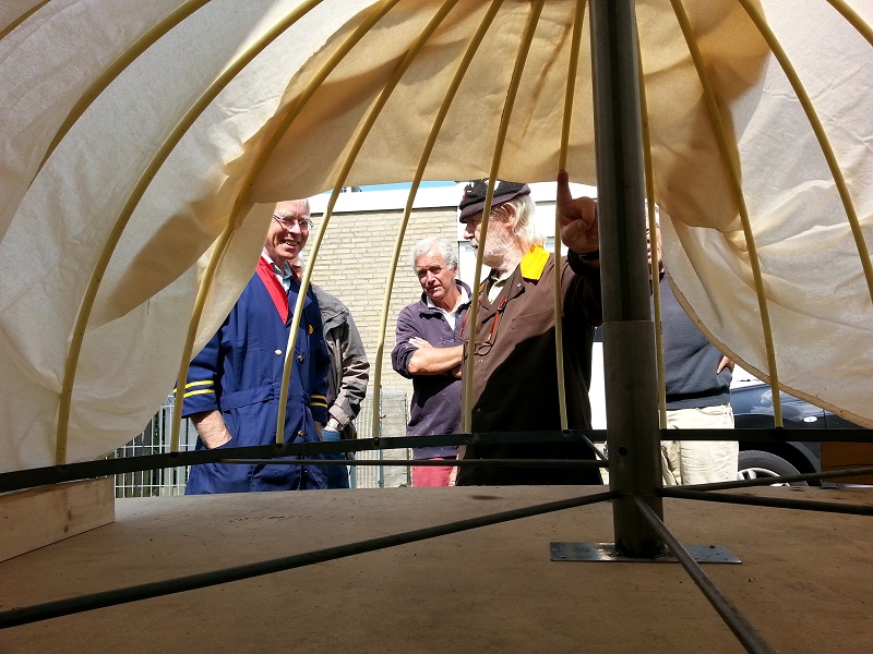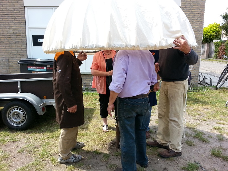 Een spannend moment is als het parachutedoek over het frame wordt gelegd. Zijn alle berekeningen goed geweest? Is de maatvoering juist geweest? Inderdaad, het klopt.